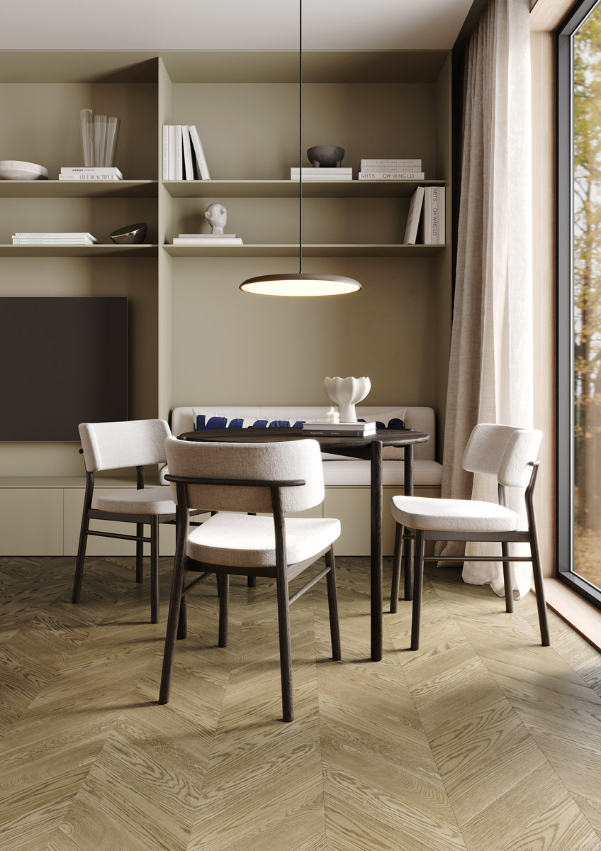 Хит продаж — оттенок кварцпаркета Дуб Карельский — полюбился дизайнерам интерьеров выраженным рисунком дерева. Вместе с тем это всё ещё нейтральная база без сильного акцента на пол.