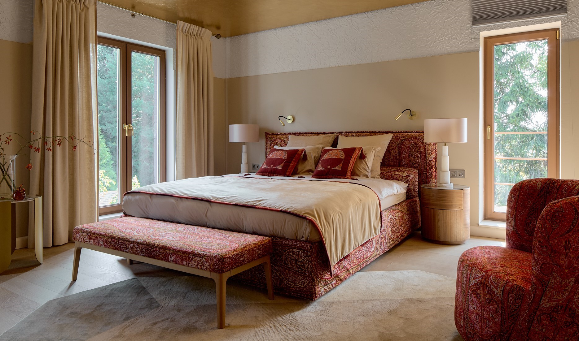 Приглушенные, «вымытые» цвета, плотные шторы, гобелены, ручная вышивка — всё это мягко создаёт атмосферу прошлой эпохи, не перегружая интерьер.